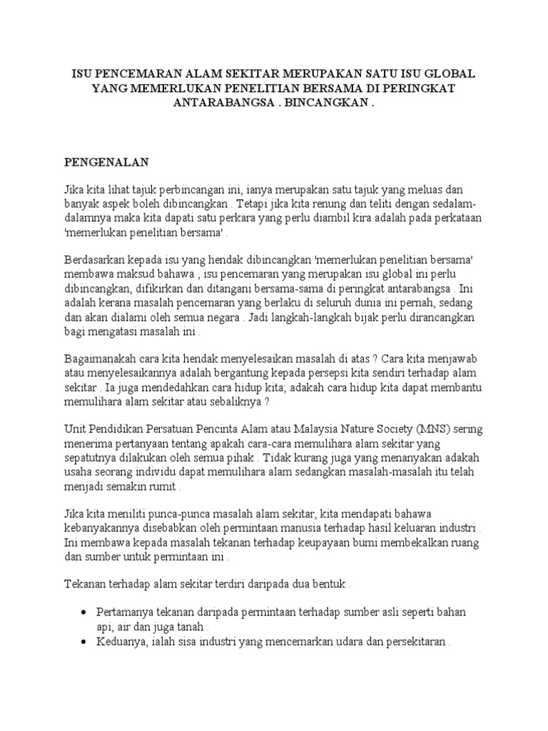 Isu Pencemaran Alam Sekitar Merupakan Satu Isu Global Yang Memerlukan Penelitian Bersama Di Peringkat Antarabangsa Pdf